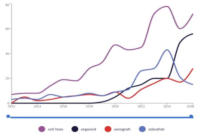 Les lignées cellulaires dominent en volume (~80 publications/an au pic), mais les organoïdes et poisson-zèbre affichent les dynamiques de croissance les plus fortes depuis 2020, malgrè un ralentissement depuis 2024 pour ce dernier.
