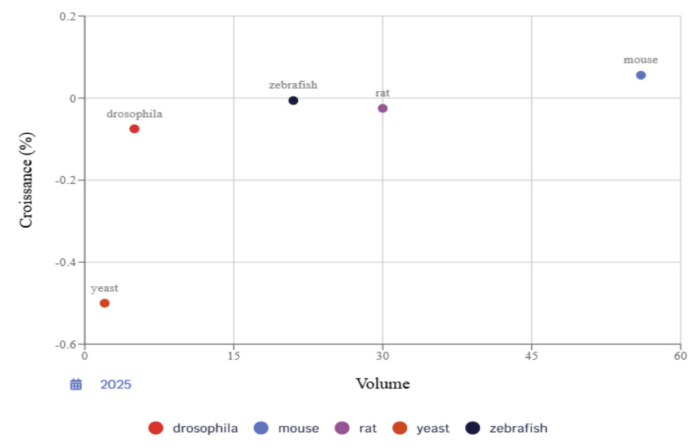 La souris (bleu) reste en tête en volume, mais avec une croissance quasi nulle. Le rat stagne également. La drosophile (rouge) et la levure (orange), autres organismes modèles classiques, n’ont ni fort volume ni faible croissance.