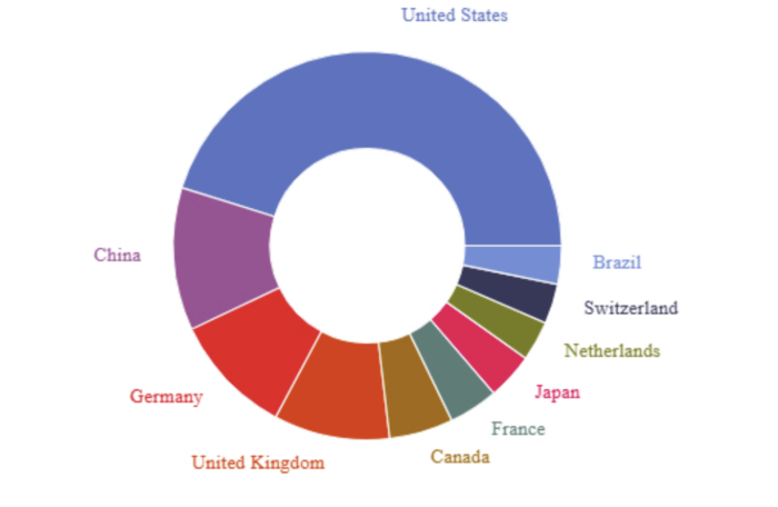Les États-Unis dominent largement la production scientifique liant poisson-zèbre, IA et développement pharmaceutique, suivis de la Chine, de l’Allemagne et du Royaume-Uni.